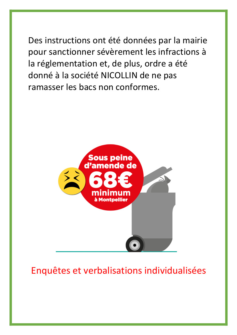 Malgré les nombreuses incitations du Conseil syndical à respecter les consignes municipales, quelques résidents d’Art Code continuent d’enfreindre la loi et de gérer leurs déchets de manière irresponsable. De ce fait non seulement le local poubelle devient un vaste vide-ordure nauséabond mais à présent la société Nicollin chargée par la ville du ramassage des poubelles, refuse, de plus en plus souvent, d’évacuer le contenu de nos bacs jaunes ou gris. Le gestionnaire par délégation du service-public ne peut en effet qu’être rigoureux depuis le rappel à l’ordre qu’il a reçu des autorités de Montpellier pour les directives de la Métropole.