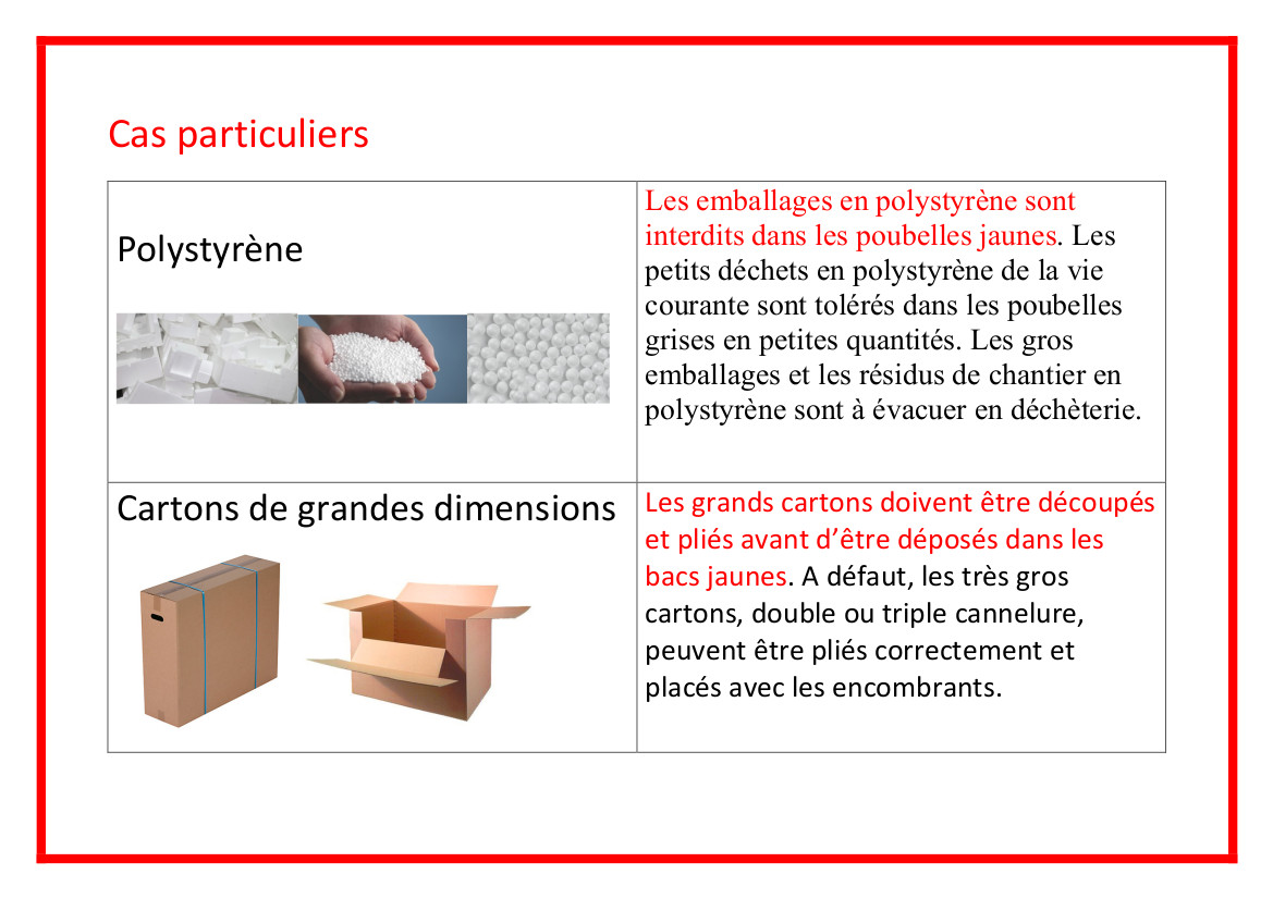 - cartons et plastiques dans les poubelles jaunes. Découpez et mettez à plat vos cartons.