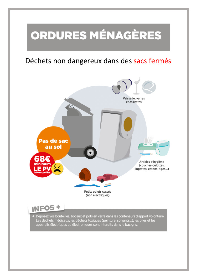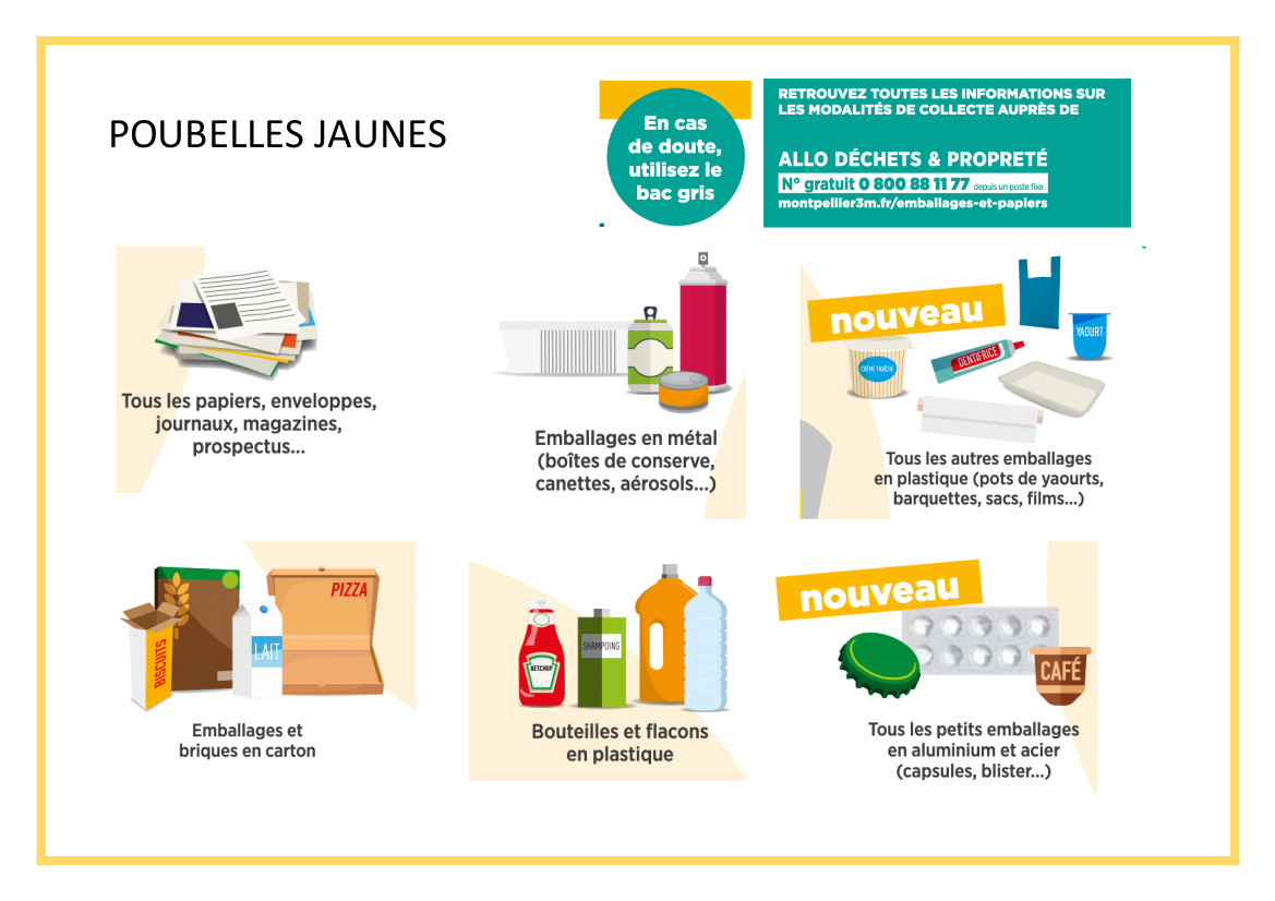 Par conséquent, les résidents ne doivent mettre dans les bacs jaunes que les papiers, cartons et autres déchets autorisés (voir le guide complet du tri sélectif de Montpellier Méditerranée Métropole). Concernant les cartons il est par ailleurs obligatoire de procéder à leur découpage comme stipulé sur les consignes affichées dans notre local à poubelles.