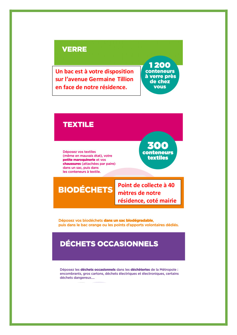 Pour maintenir la bonne évacuation de nos déchets, le Conseil syndical, a placé des affiches dans le local des poubelles pour vous aider à faire correctement le tri de vos déchets et disposer de vos encombrants, lesquels sont ramassés le jeudi sauf les plus gros, comme les matelas ou les grands blocs de polystyrène qui doivent être évacués à la déchèterie municipale par vos propres moyens.
